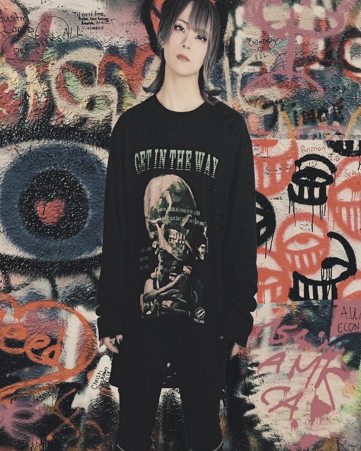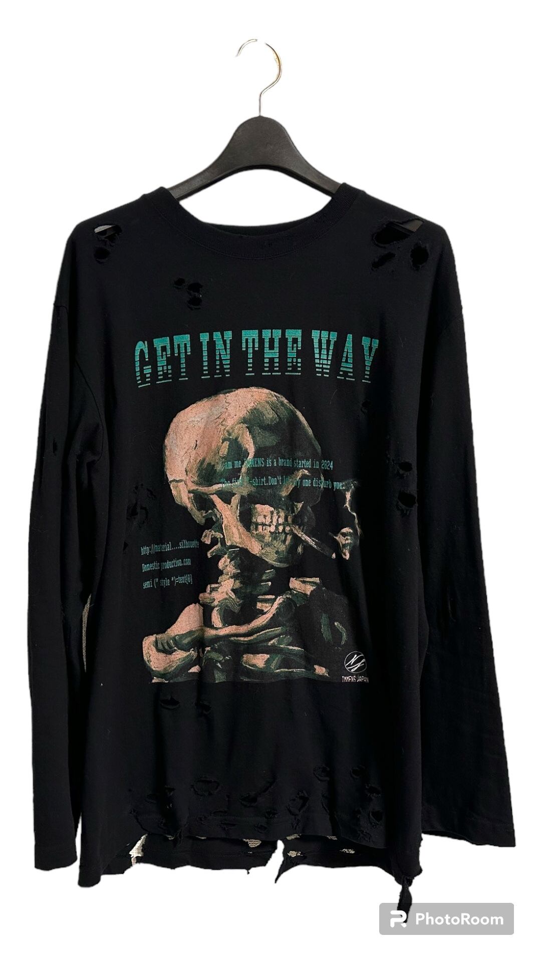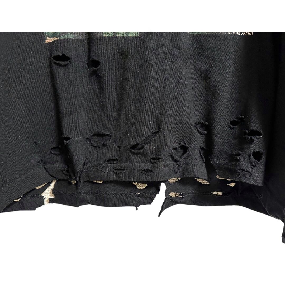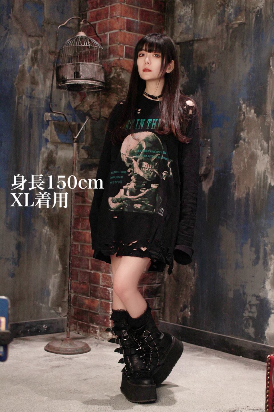 150cm:いい感じにオーバサイズで着れるダメージ加工もあって普通のtシャツとはまた違った存在感を出してくれる(XL着用)