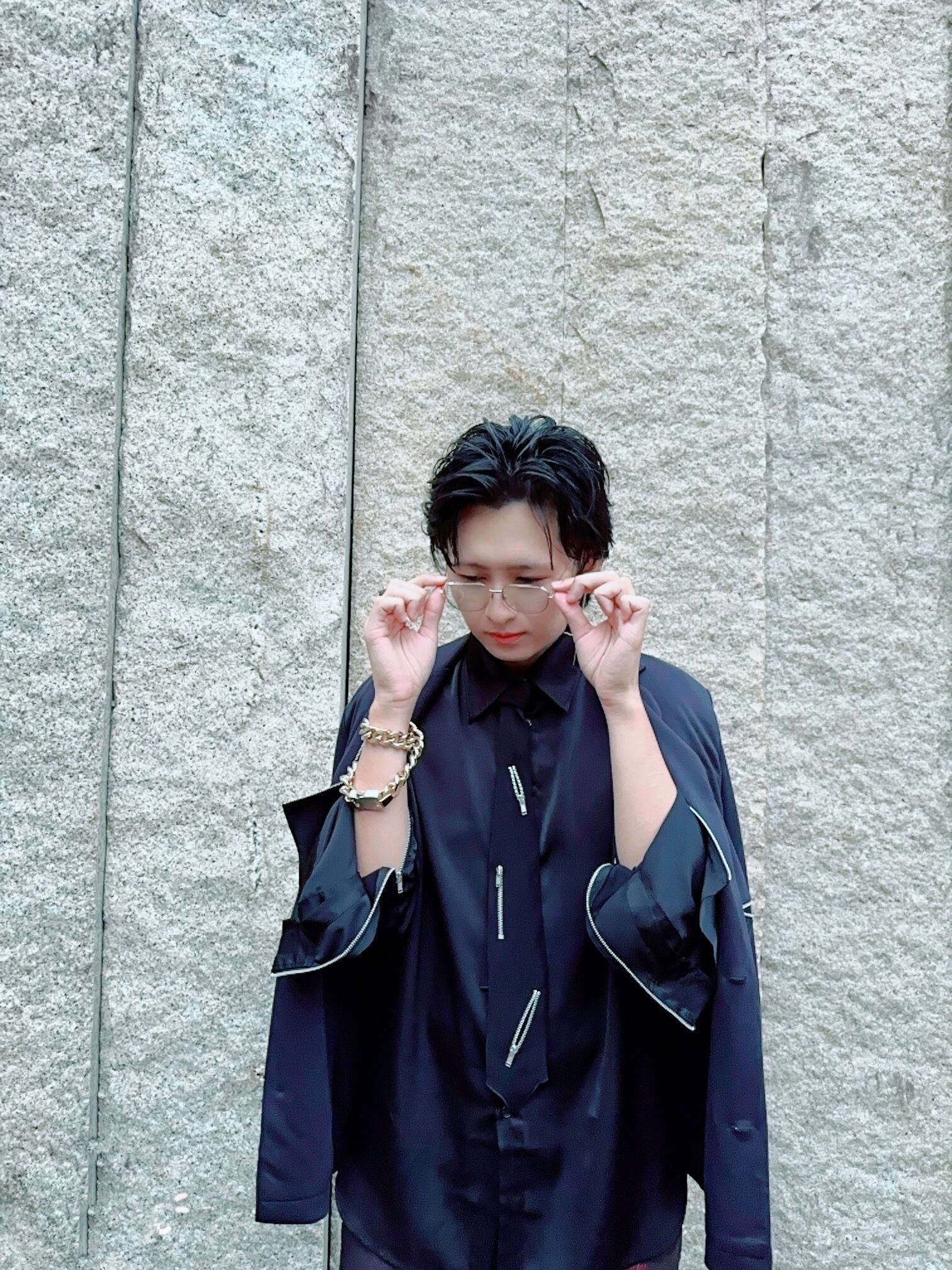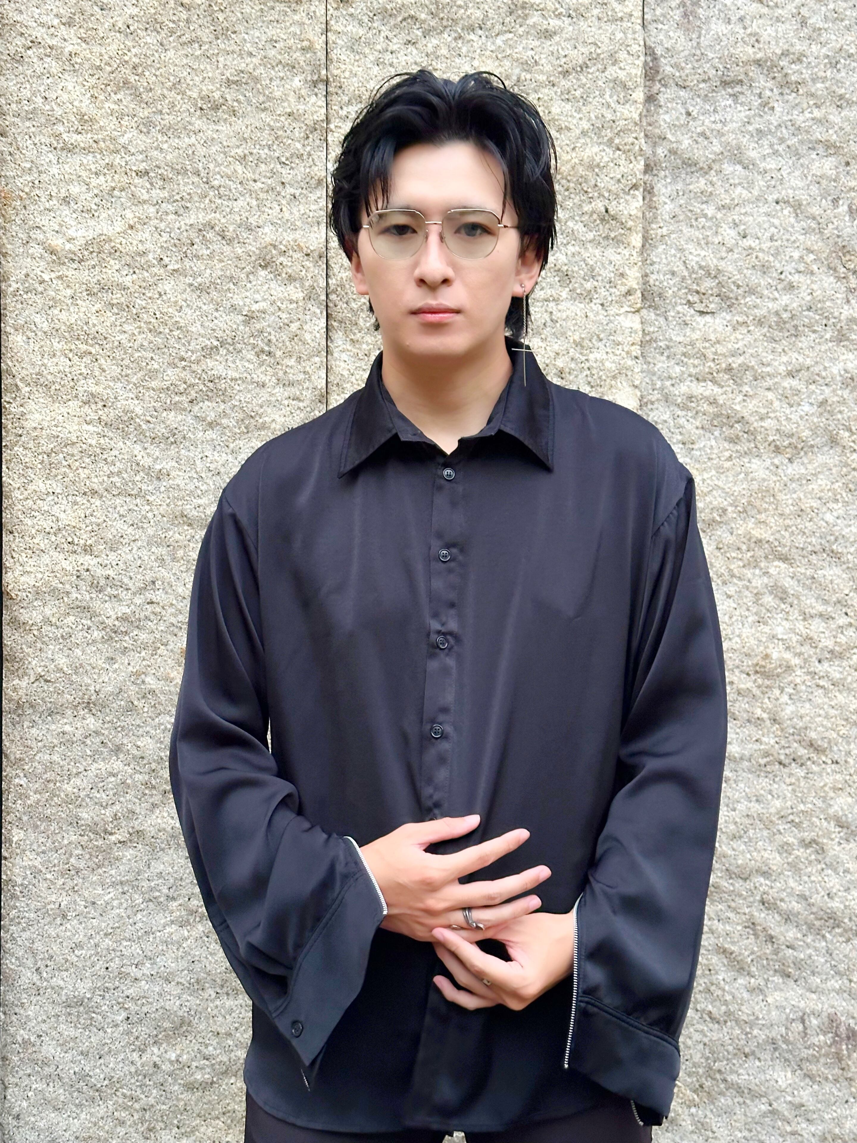 IMMENSのシャツは、ポリエステルとレーヨンを使用し、滑らかな肌触りと軽やかな着心地が特徴です。シンプルでありながら、袖口に配置されたファスナーがアクセントになり、スタイルに変化を加えられるユニークなデザインです。袖口のファスナーを開けることで、袖がスリット状に開き、動きやすさと個性を演出します。