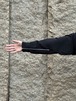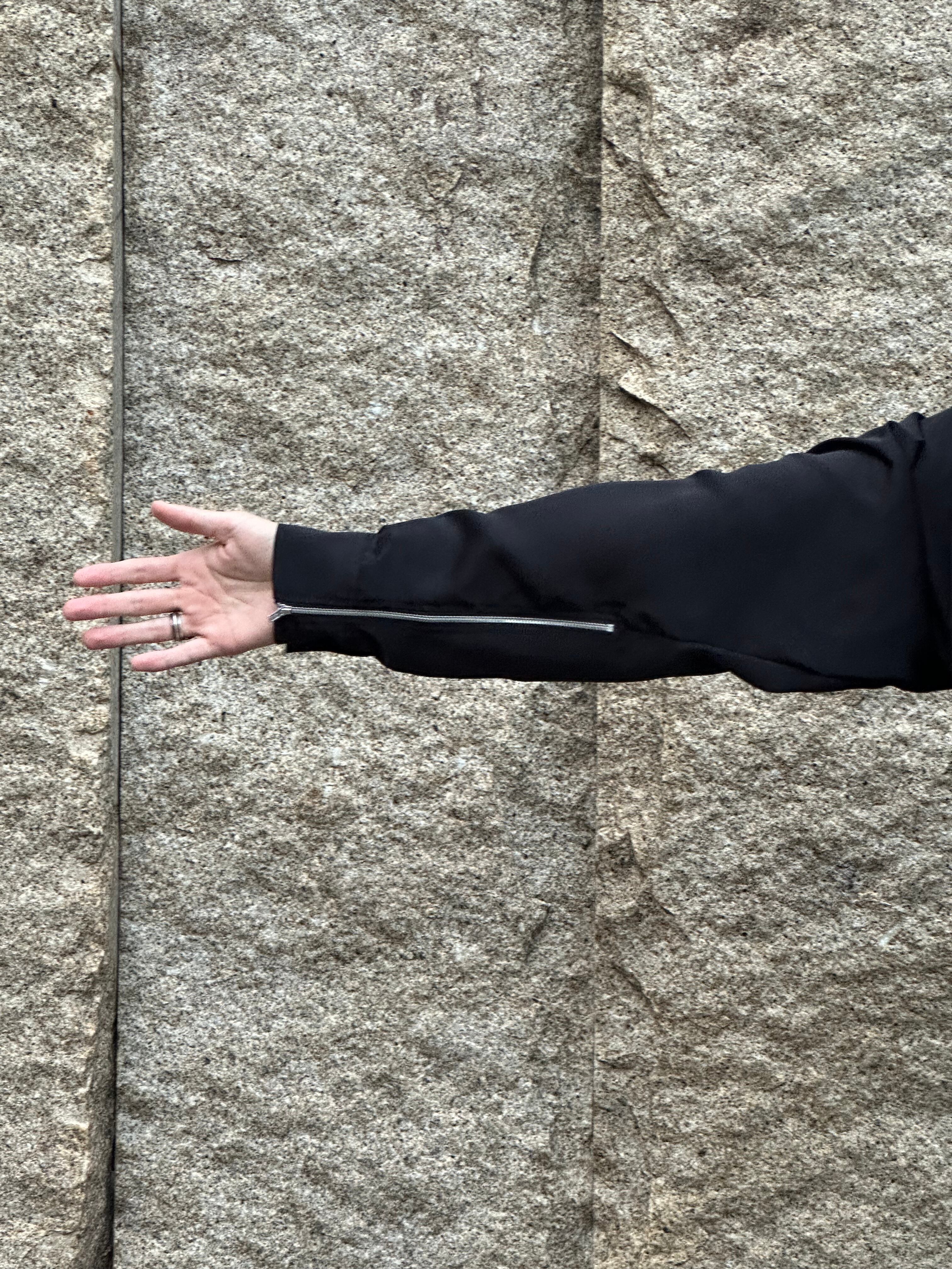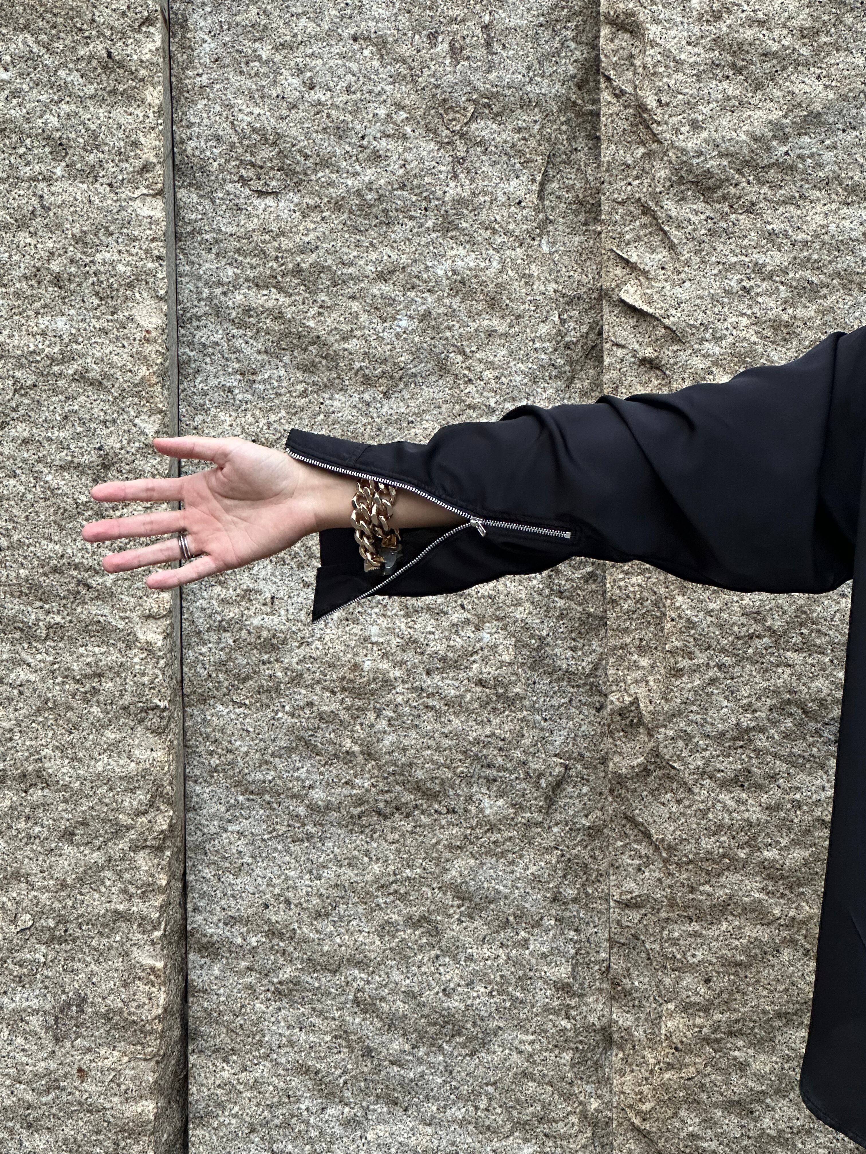 •袖口のファスナーデザイン: 袖口にファスナーがついており、開けることで袖が開き、よりリラックスした印象を与えます。機能的かつスタイリッシュなアクセントです。