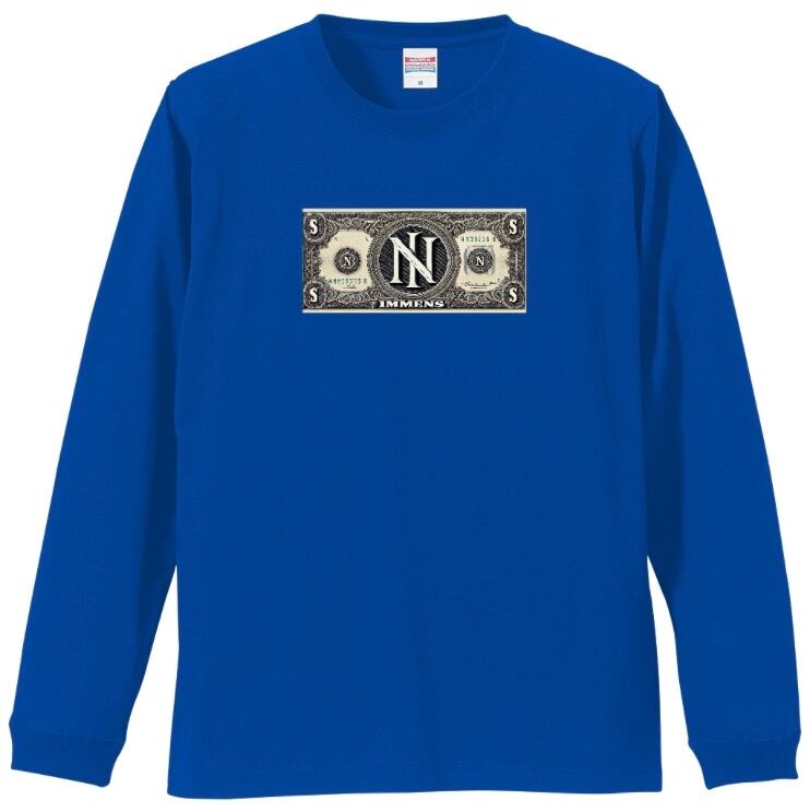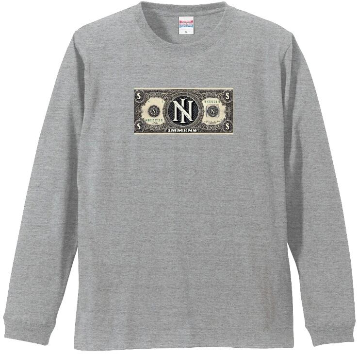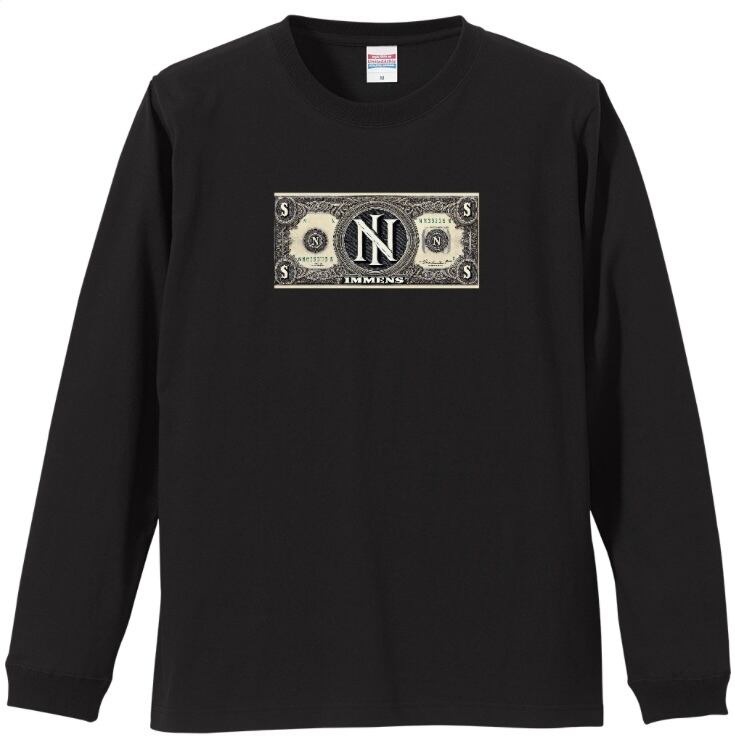•フロントのN札デザイン: 前面には「IMMENS」ドル札(N札)をあしらい、シンプルなロングTシャツにユーモアと個性を加えています。ストリートの文化を感じさせる独自のデザイン。